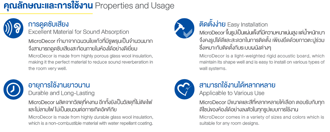 แผ่นดูดซับเสียงหุ้มผ้าสำหรับผนังตกแต่ง MICROFIBER รุ่น MicroDecor สามารถใช้บุผนังเพื่อดูดซับเสียงสะท้อนภายในห้อง และตกแต่งผนังเพื่อความสวยงาม ผลิตจากแผ่นฉนวนใยแก้วขึ้นรูปเป็นแผ่นแข็ง มีความหนาแน่นสูง และหุ้นด้วยผ้าสีสันสวยงาม ติดตั้งง่าย เหมาะสำหรับการติดตั้งในห้องประชุม ห้องอัดเสียง ห้องคาราโอเกะ หรือหอประชุมภาพยนตร์ มีขนาดและสีที่หลากหลายให้เลือกสรร ตอบรับกับทุกดีไซน์ของห้องได้อย่างลงตัวในทุกรูปแบบการใช้งาน