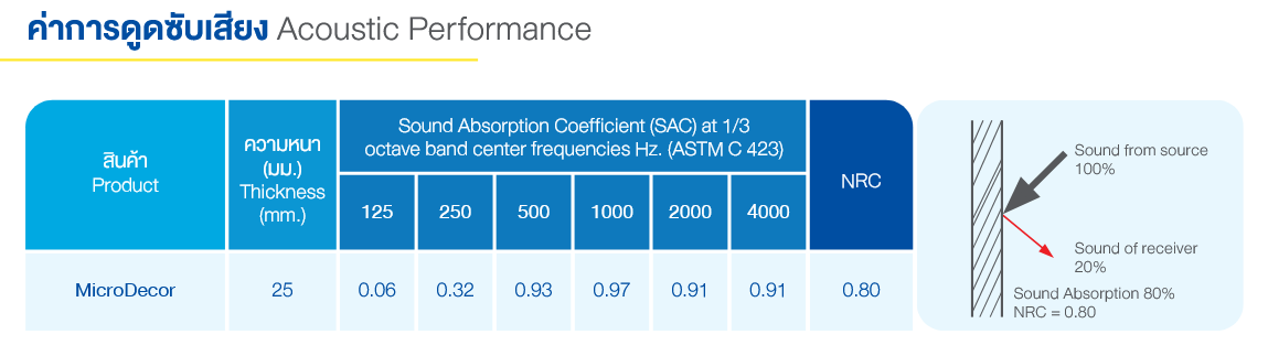 แผ่นอะคูสติกสำหรับผนังตกแต่งดูดซับเสียง ผลิตจากฉนวนใยแก้วที่มีรูพรุนเป็นจำนวนมาก จึงสามารถดูดซับเสียงสะท้อนภายในห้องได้อย่างดีเยี่ยม