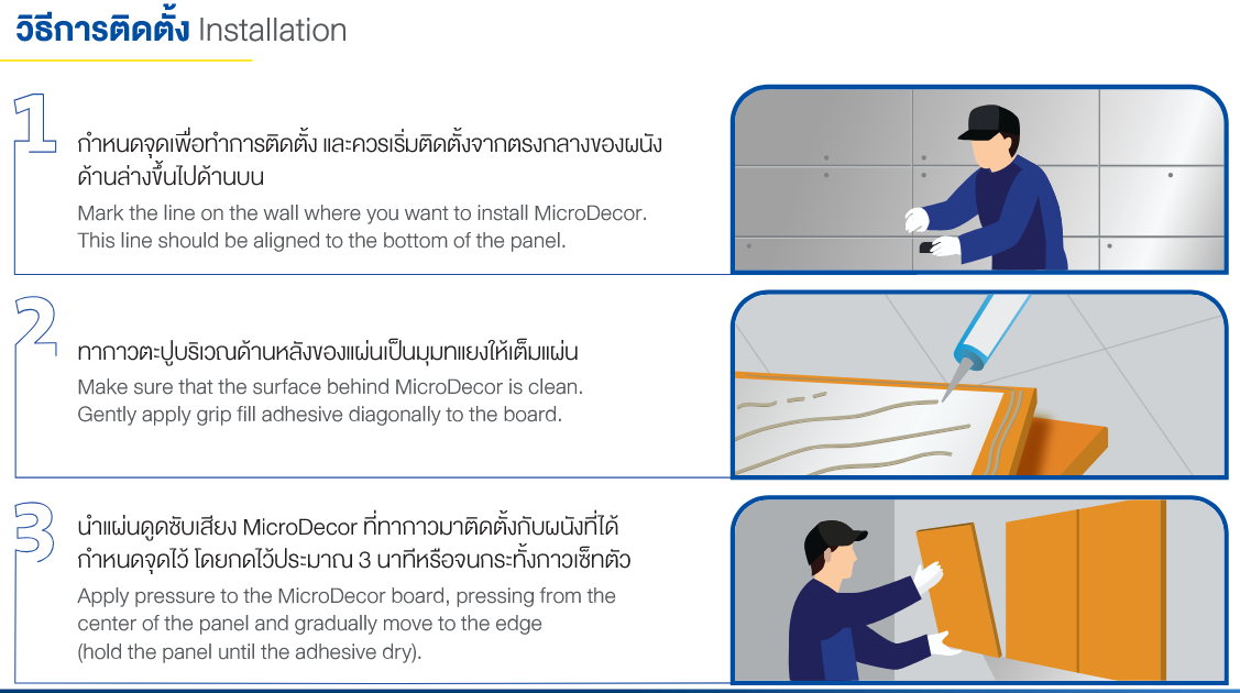 นําแผ่นดูดซับเสียง MicroDecor ที่ทากาวมาติดตั้งกับผนังที่ได้กําหนดจุดไว้ โดยกดไว้ประมาณ 3 นาที หรือจนกว่ากาวเซตตัว